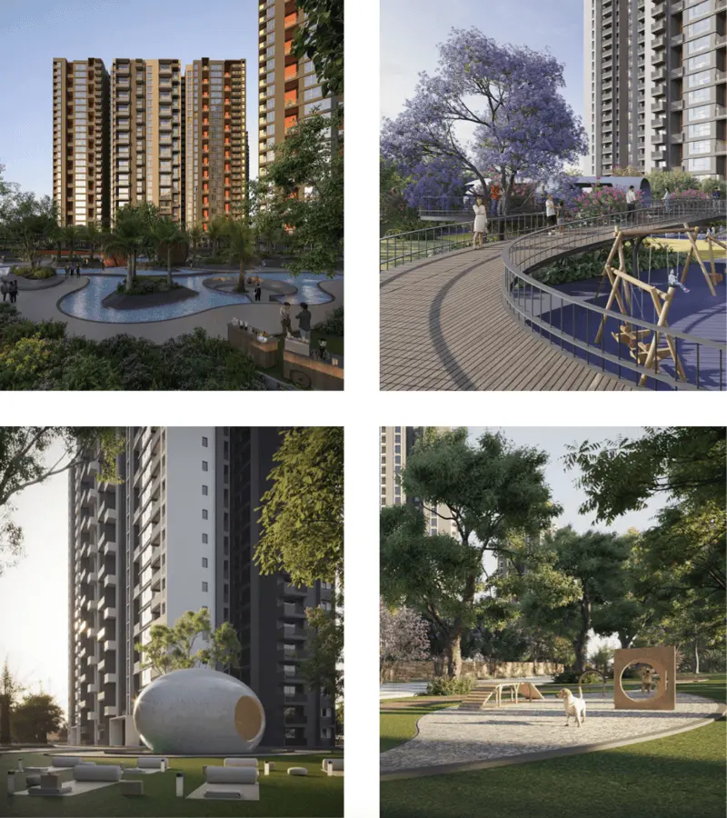 The project offers spacious 3, 3.5, 4 BHK, and Duplex homes, designed to maximise ventilation, natural light, and functional comfort. With a low-density masterplan and large stretches of green spaces, the community feels expansive and serene, unlike typical apartment developments.